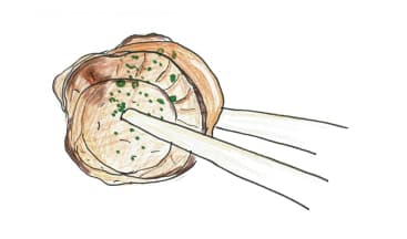 ホタテは北海道産の大玉。貝柱もヒモもまるごと味わえるのが発売当時からのこだわりです。いろいろな食感が楽しめて、噛むと旨味が口じゅうに溢れます。焼くと縮んで硬くなりがちなホタテの調理には、僕もいつも気をつけていますが、それが驚くほどふっくら柔らかに仕上がっています。焼いた後にさらにガーリック風味のタレに絡めているので味の絡みがよく、香ばしい匂いはまさしくステーキそのもの。