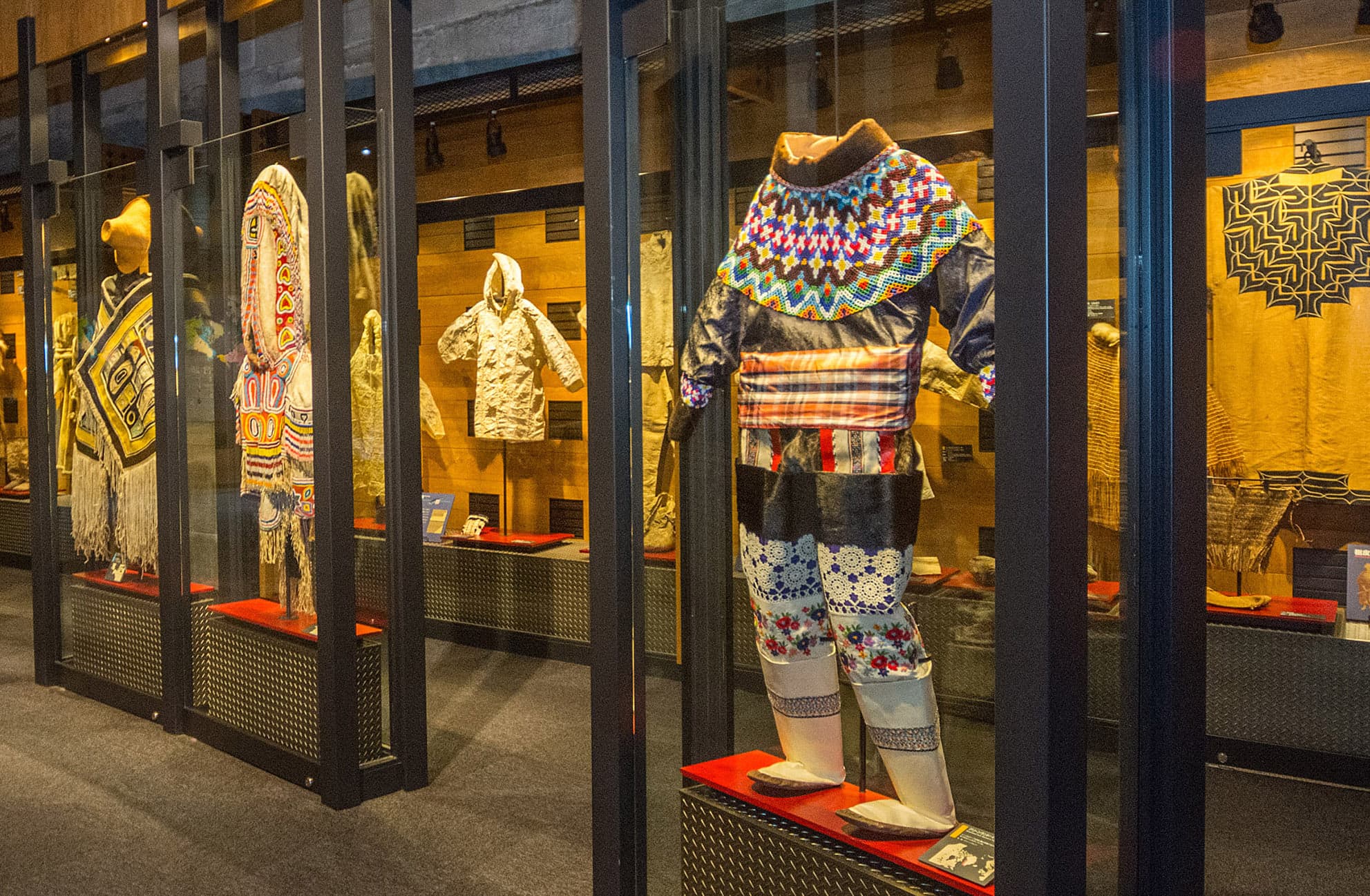 展示室でまず目を奪われるのは、毛皮や渡来のビーズを使った衣装の数々だ。厳しい自然の中で生き抜くための巧みな手仕事に圧倒され、豊かな色彩やデザインで人生を彩ろうとする美意識にうっとりする。